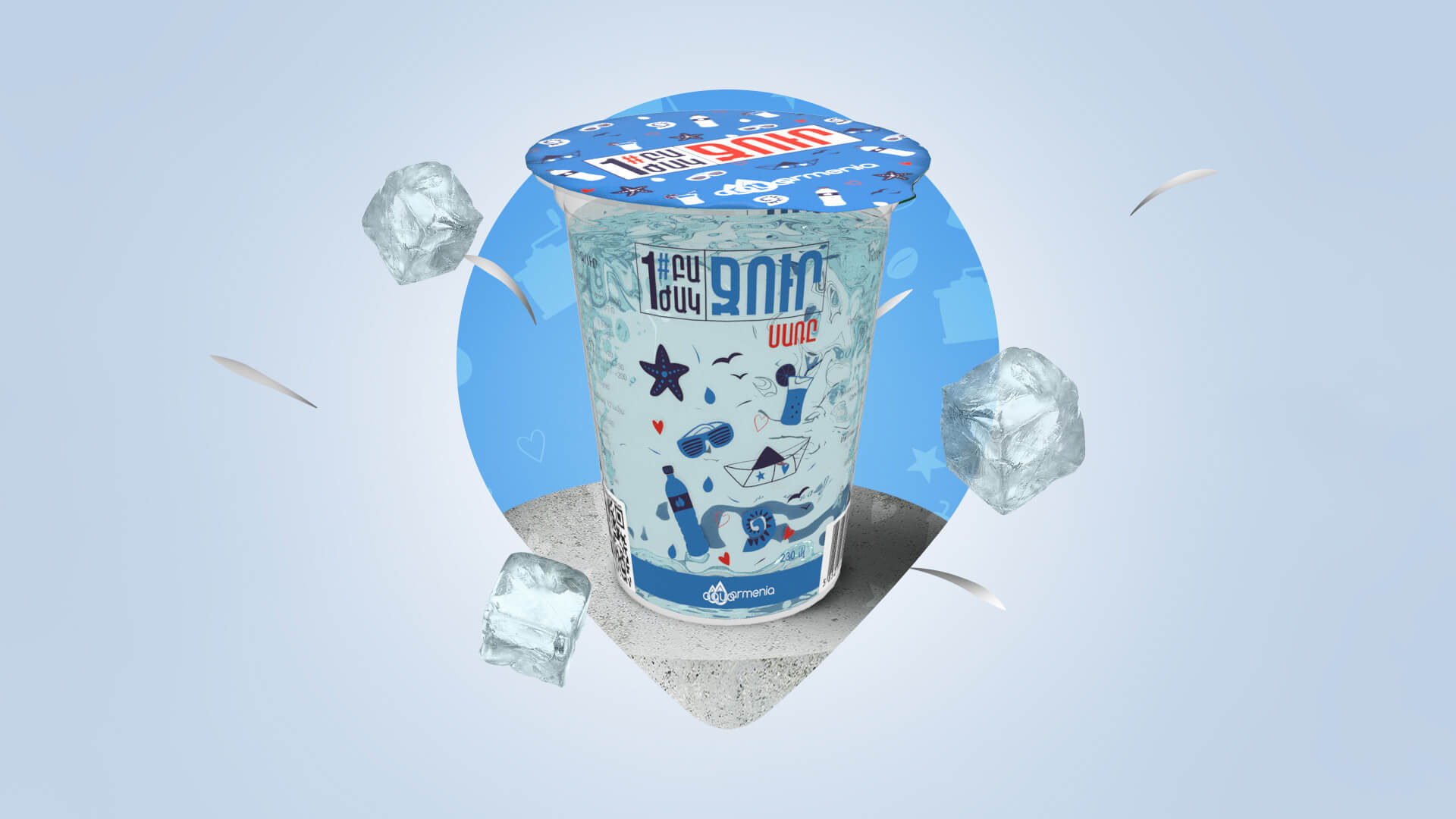 Water is the essential and necessary part of our lives. However, usually water comes with larger bottles and most of it is wasted. By the request of Aqua Armenia, Domino Production came up with a sufficient and saving way of selling water – small cups. 1 cup provides the consumer with a cup of cold and fresh water in the midst of a hot summer. But it is not only water which is essential for us. A cup of cool coffee and tea is never extra and Domino Production also designed it for Aqua Armenia. All of these cups have interesting and light icons on them, different for each kind of beverage.