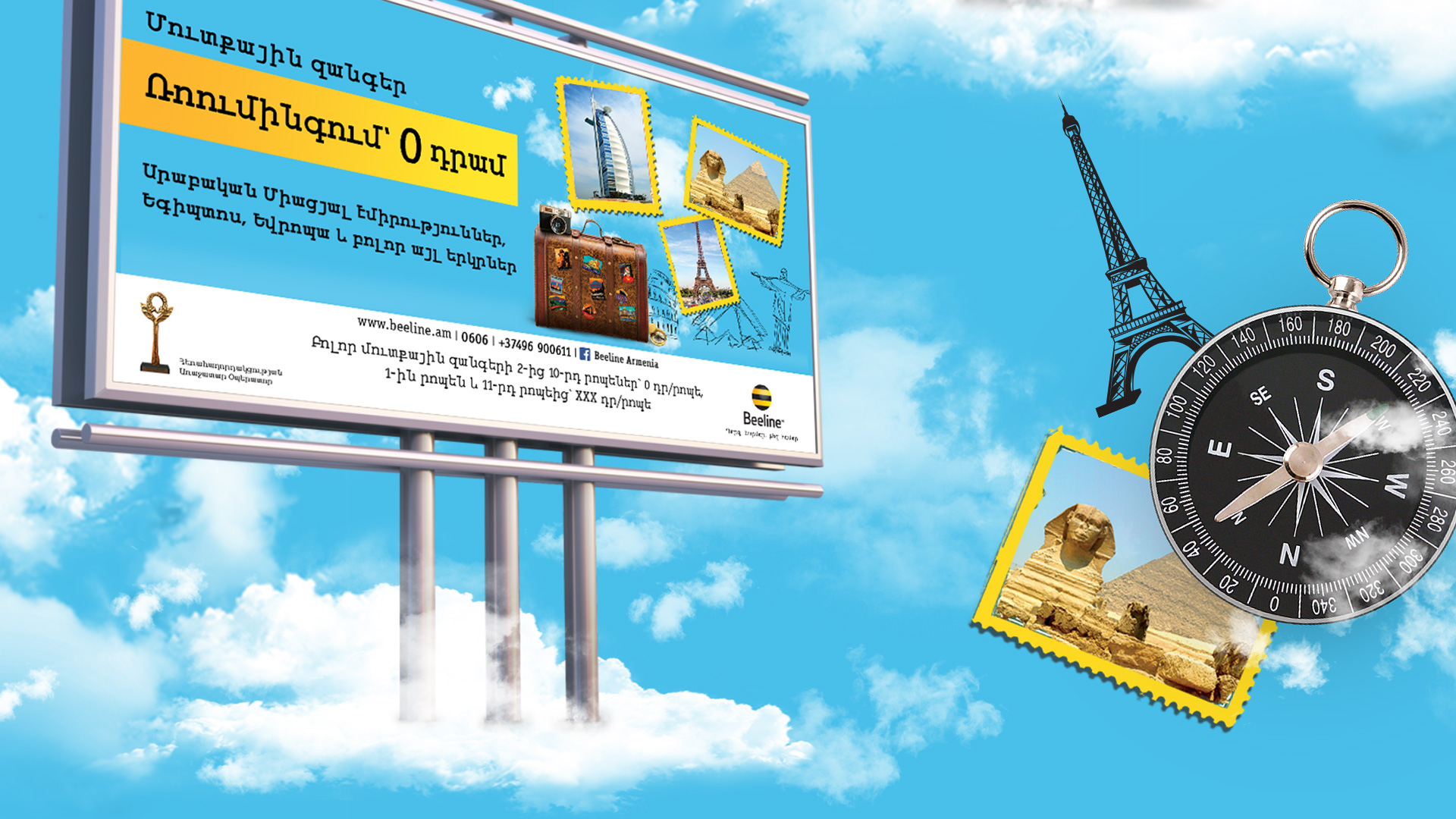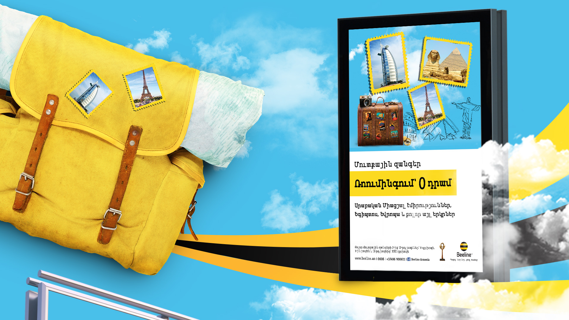Being away from your home country is hard and it is even harder when you have to constantly make phone calls but it costs a fortune. That’s why Beeline Armenia had an offer for its customers. Nothing would be charged on the roaming service from the users if they had an incoming call while, for example in Egypt, Dubai or Paris. And we were responsible for the visual part of the offer, the billboards. Our designers created an image which would give one “the suitcase mood” and a sense of travelling. The background of the banner is the sky which resembles airplanes, thus, flying. And other pictures include famous destinations which can be recognized without even thinking for a split second and which are famous among Armenians. And the commercial of Beeline is not really a commercial of Beeline if it does not have the famous yellow color.