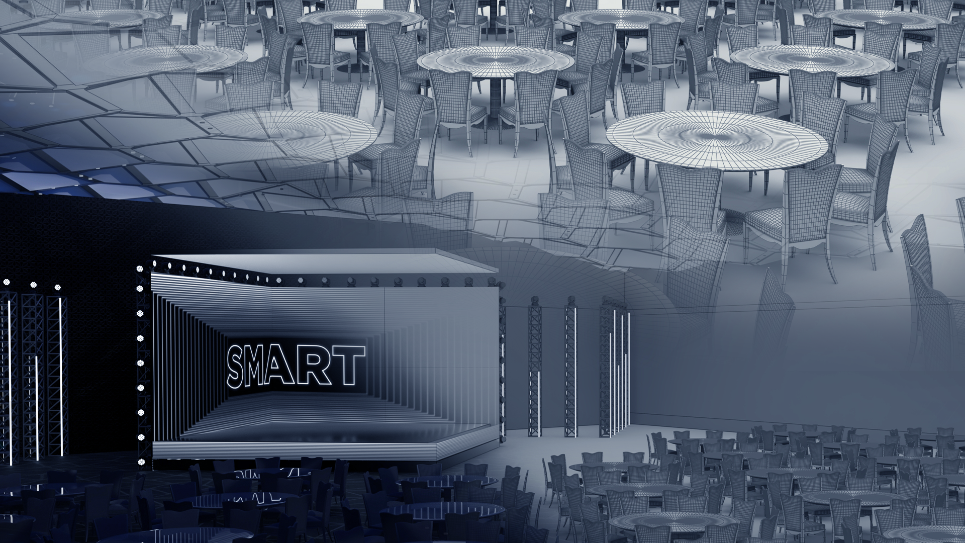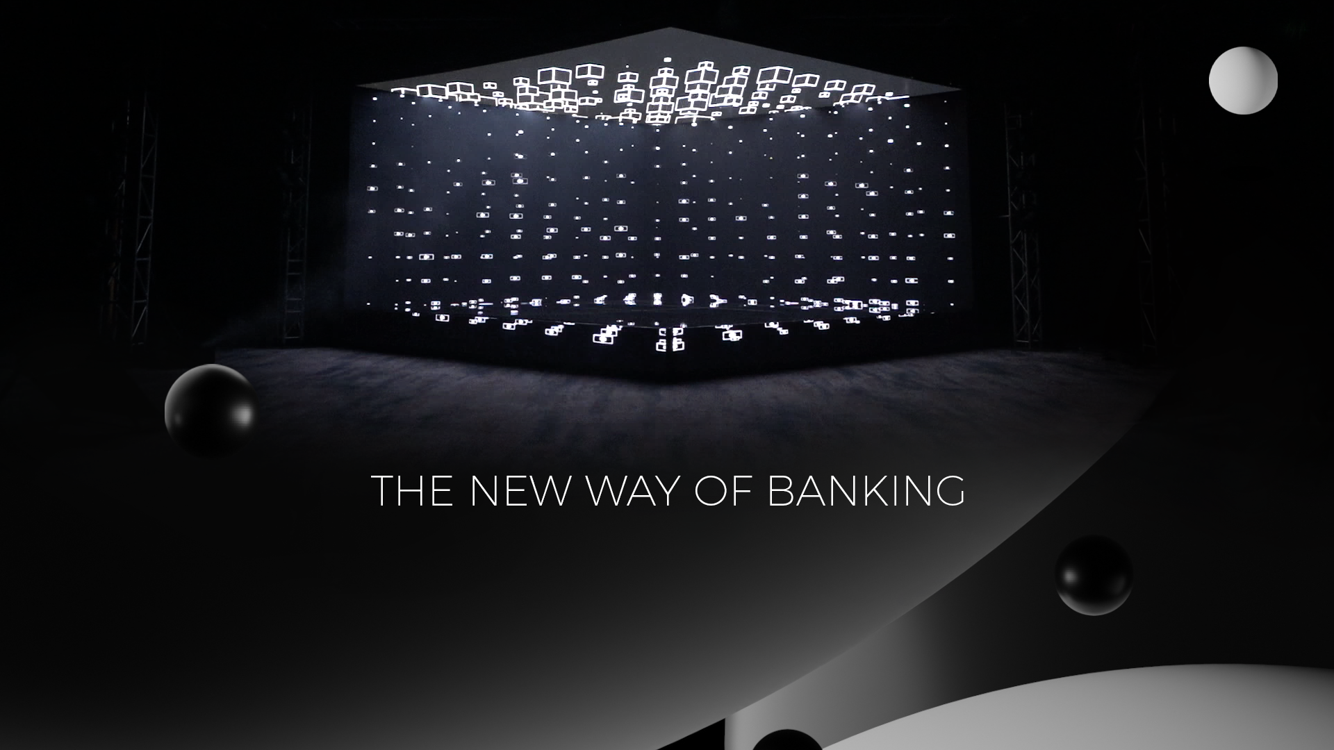 The immersive shape of the stage symbolizes the feeling of safety and security that the perfect banking digital system can give its customers. The unique shape of the stage dictated the development of a corresponding animation with 3D effect. Augmented with a concurrent light show, the effect of the show was enormous and impressive.